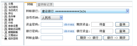 4、入金请点击“银行资金转期货账户”,出金请点击“期货账户资金转银行”。